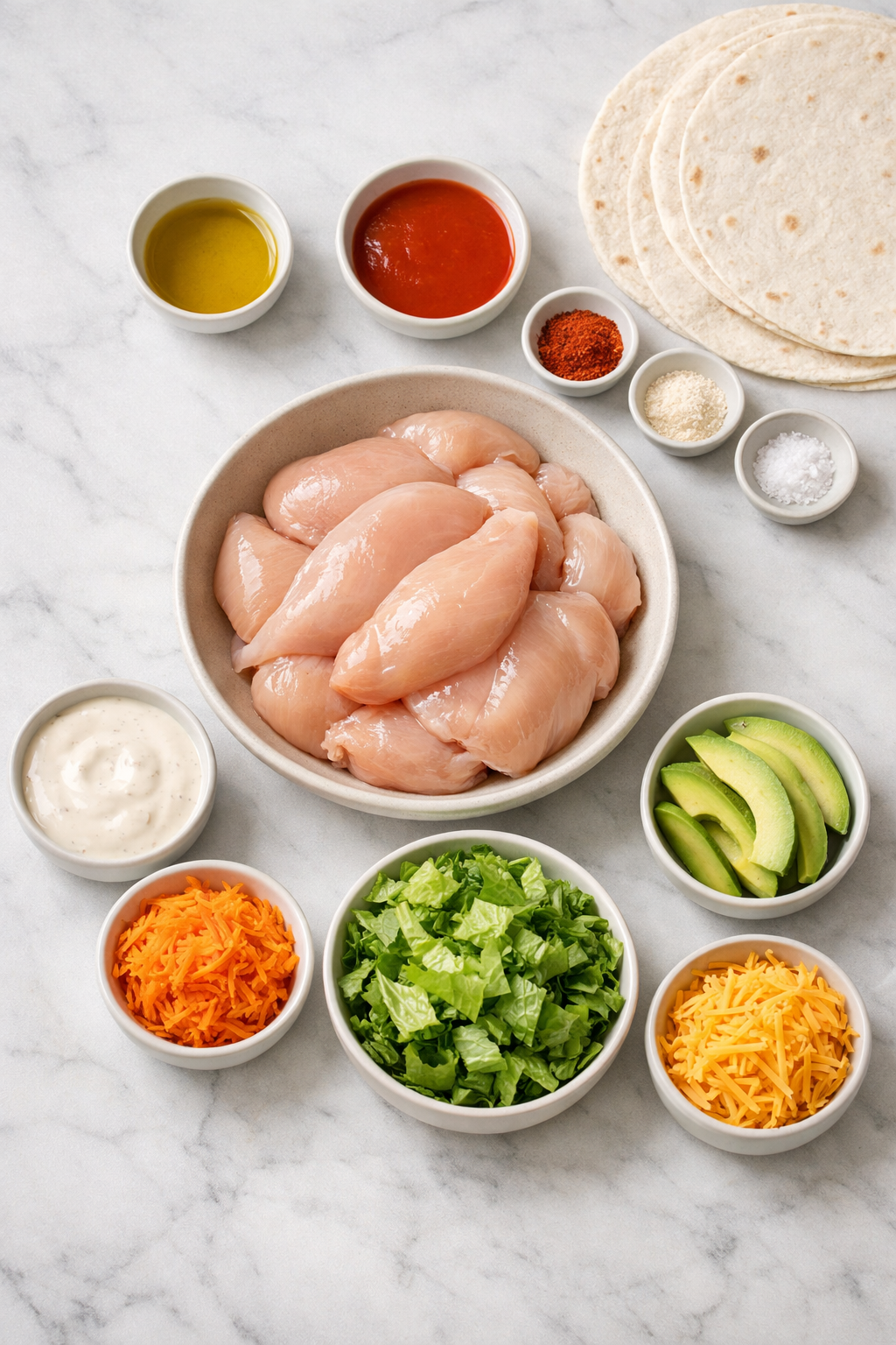 6. While the chicken cooks, lay out the tortillas and spread each one with a light layer of blue cheese or ranch dressing.
